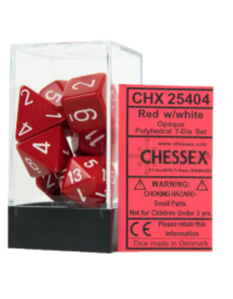 This set contains 7 Opaque red dice with white numbers with the following shapes: